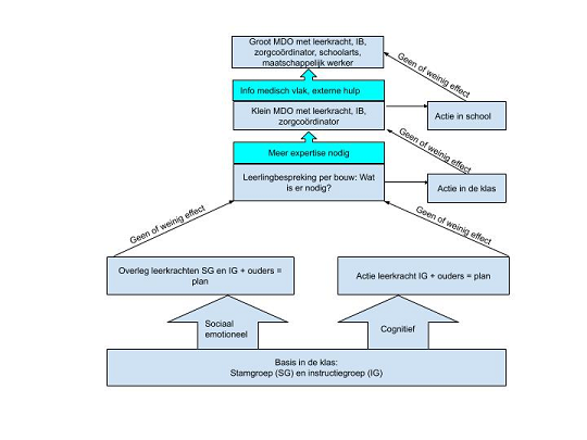 Als het gaat om de zorg voor uw kind, proberen we zo dicht mogelijk bij het kind te blijven. We werken vanuit de basis in de klas, waarbij de leerkracht direct betrokken is. De leerkracht informeert u over de ontwikkeling van uw kind. Wanneer uw kind meer dan de basis nodig heeft krijgt uw kind extra aanbod in de klas. Indien blijkt dat het extra aanbod onvoldoende toereikend is, kan een leerlingbespreking plaatsvinden op school. Hierover wordt u als ouder altijd geïnformeerd. Mocht blijken dat het wenselijk is dat de gedragsdeskundige en intern begeleider meekijken en meedenken, dan zal er een klein MDO (Multidisciplinair Overleg) georganiseerd worden. Indien blijkt dat er binnen het huidige aanbod in de school niet in de onderwijsbehoeften van uw kind kan worden voorzien, dan kan er samen met u worden besloten tot verwijzing voor externe zorg. Dit wordt besproken in het groot MDO.
